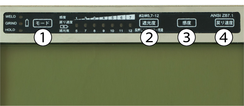 ①モード切替ボタン WELDモード ⇒ GRINDモード ⇒ HOLDモード ⇒ WELDモードの順に切り替わります。 ②遮光度調整ボタン(長押し:バッテリー残量確認) 溶接作業に合わせて遮光度を7段階(#5,#7~#12)調整します。 ③感度調整ボタン 光を感知するセンサーの感度を7段階調整します。 ④戻り速度調整ボタン 通常の明るさに戻る時間を7段階(約0.06秒~約1.0秒)調整を行います。